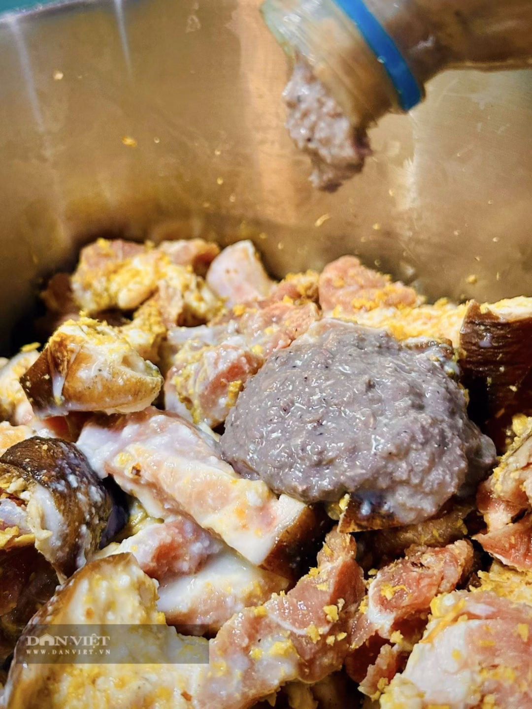 - Trộn chân giò với riềng, hành tím, nghệ, mắm tôm, nước mắm, đường, tiêu, mẻ và ớt (nếu thích).