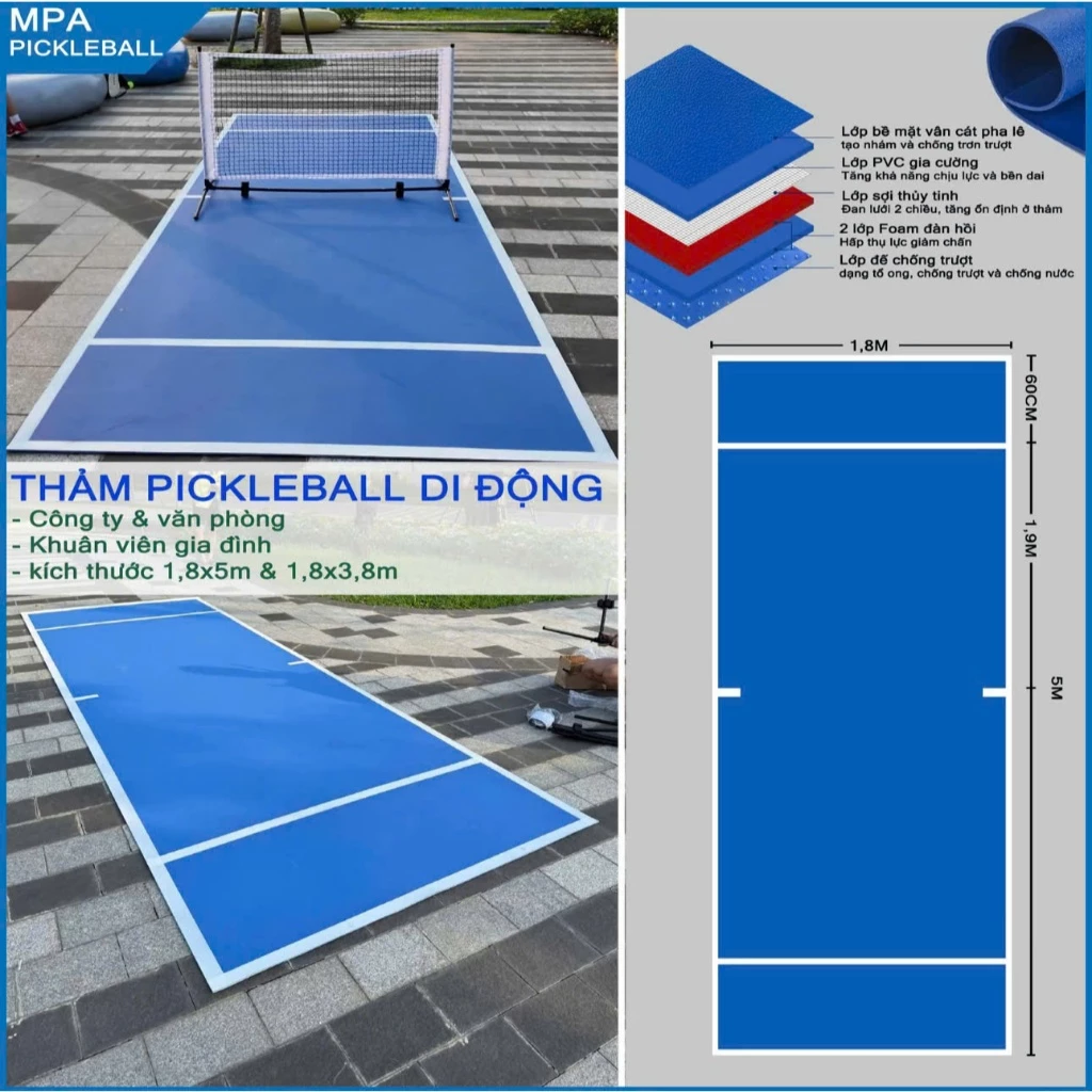 - Kích thước: Thảm Pickleball tiêu chuẩn thường có kích thước 5m x 3,5m. Tuy nhiên, bạn cũng có thể tìm thấy các kích thước khác tùy thuộc vào nhu cầu của mình.