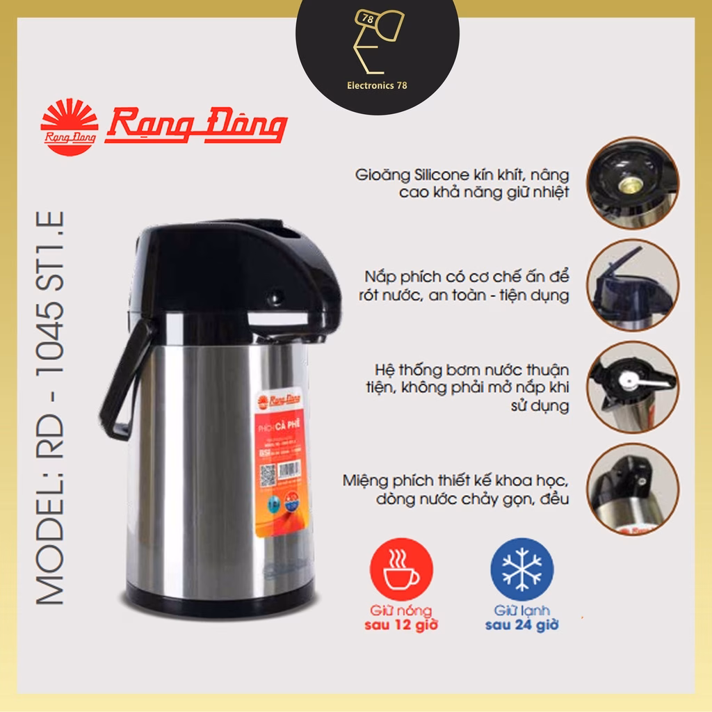 🔥 [1L-2L] Phích giữ nhiệt Inox cao cấp Rạng Đông 2045 ST1.E, Cần bơm rót nước, Đế xoay 360 đang giảm giá!
